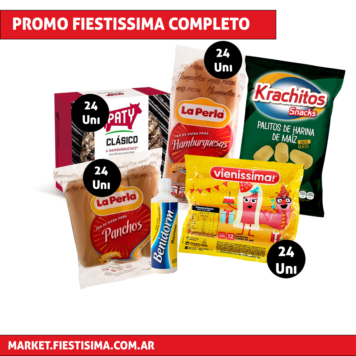 Promo Fiestissima Completo- 24 hamburguesas Paty Clásicas x 70 grs + 24 panes La Perla + 24 salchichas cortas Vienissima + 24 panes de panchos La Perla + 1 Palitos de harina de maíz + 1 Aderezo